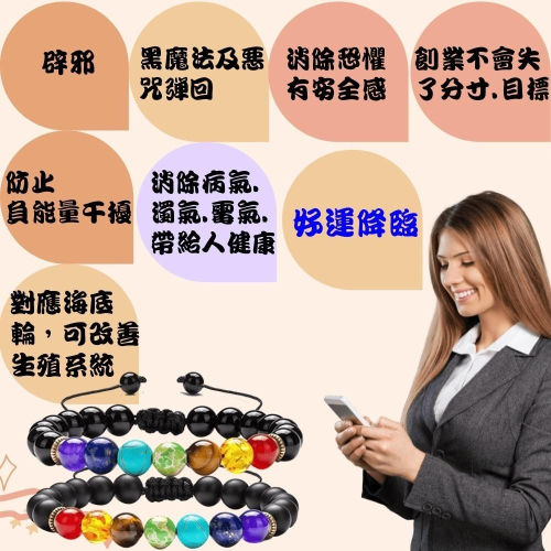 安心首選~7脈輪黑瑪瑙手鍊 黑瑪瑙是佛教的七寶石之一,可辟邪、防止低靈、負能量的侵擾,可將黑魔法及惡咒等負能量全數反彈回原施加者。可消除恐懼,讓人有安全感。是居家、事業防護的寶石。黑瑪瑙的能量,都有著沉厚、安定及柔和特性,具促進幸福及富足之效。能招好運降臨。有助舒緩壓力。 配戴方式 配戴在左手,左進右出,依循宇宙迴圈的方向,將能量輸入人體,並且將不良能量阻擋在外,以達到保護及增強的效果。 但黑色系寶石俱有吸收負能量作用,可於調整身體能量。 創業型通常會放一顆大顆黑瑪瑙(有底座)在辦公室裡,調整辦公室磁場,擴大自己的隔局,做事進退能平衡。 淨化方式 所有淨化方法皆可使用。筆者常常是一下班就拿下,掛放在水晶簇上,或是放在白水晶碎石盒上,淨化一個晚上,隔天出門,再戴上。 使用時機 守護自己不受外界干擾時 幫助你接地,帶來內在的力量 肯定自己的努力與存在 對應脈輪: 海底輪,也可以使用在小腿或是關節上 貼心小叮嚀: 人要學會細心觀察,不管是觀察自己,還是觀察萬物,你會發現,水晶即使有這些功能,一旦你選擇忽略或默視他,我行我素,你不會感知到他的幫助,常常內觀,經常讓自己再慢一點,不斷的去提昇自己,自立自強,勝過依賴,他們可以輔助你,幫你加分,但人生的關鍵在自己哦! 產品說明 品名:7脈輪黑瑪瑙(可調節編織繩) 材質:水晶、天然石、琥珀、瑪瑙、合金 珠子尺寸:8MM 重量:23g 長度:約19cm 可調節編織繩:適合手腕尺寸範圍 16.5-23.8cm 可調節繩適合大多數人 加乘效果 黑瑪腦+對應7脈輪的水晶、天然石、琥珀、瑪瑙 可平衡每一個脈輪,能量保持在最佳狀態 ~~~我們還有很多水晶未上架,如果您有需求,請直接聊聊唷~~~ 水晶、礦石皆有天然紋路,照片和實體會有微微色差,完美主義者請勿下單 免責聲明 此信息不能代替適當的醫療護理。所提供的信息不能替代專業的醫療或健康建議、診斷、檢查或治療。結果往往取決於未知因素。結果可能因人而異。沒有任何索賠。