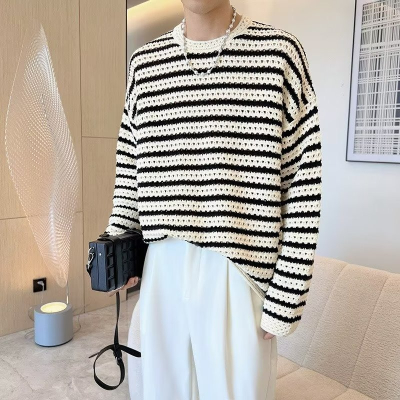 『癮品流行』日系長袖上衣 毛衣 撞色條紋針織衫 打底衫 設計感 休閒百搭 男女同款 S-3XL