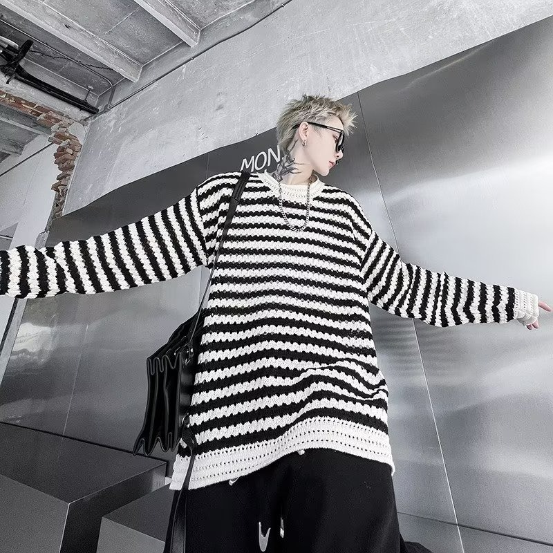 『癮品流行』秋冬季韓版長袖 圓領針織衫 設計感 寬鬆毛衣 條紋撞色毛衣 男女同款 S-3XL