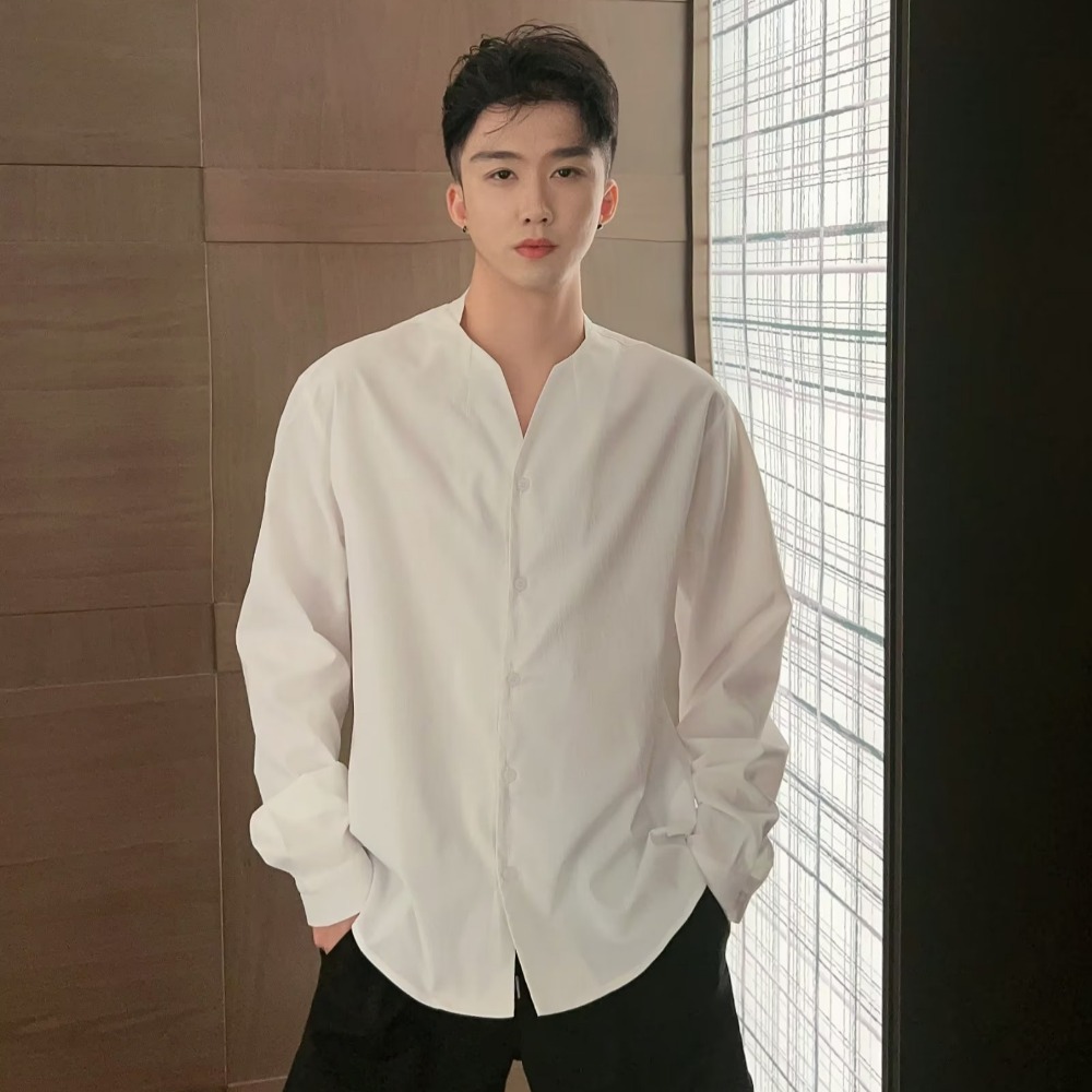『癮品流行』夏季薄款 韓版無領襯衫男長袖上衣 襯衣 設計感 簡約純色 休閒百搭 大碼寬鬆 M-3XL
