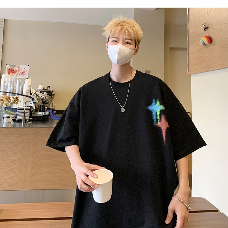 『癮品流行』夏季T恤男 星星印花 美式純棉T恤 設計感 圓領上衣 五分袖 休閒百搭 大碼寬鬆 M-3XL
