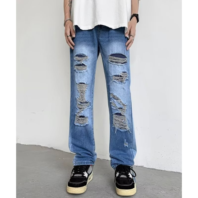 『癮品流行』美式高街牛仔褲 直筒褲 牛仔破洞褲 九分褲 設計感痞帥 休閒百搭 修身顯腿長 S-3XL