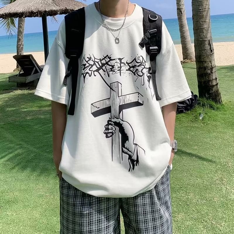 『癮品流行』十字架印花 美式字母印花短袖T恤 復古高街圓領上衣 純棉五分袖 休閒百搭 大碼寬鬆 M-5XL