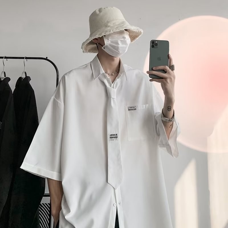 『癮品流行』男生夏季襯衫 領帶襯衫冰絲透氣 翻領上衣 開衫襯衣口袋 五分袖襯衣 休閒百搭 M-3XL