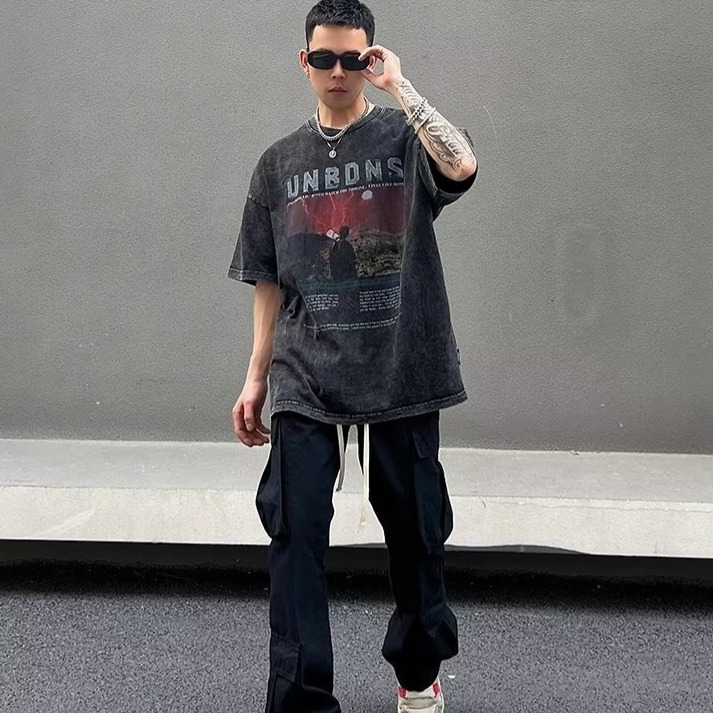 『癮品流行』男生夏季短袖T恤 美式復古高街水洗做舊純棉T恤 圓領上衣 五分袖 休閒百搭 設計感痞帥 M-3XL