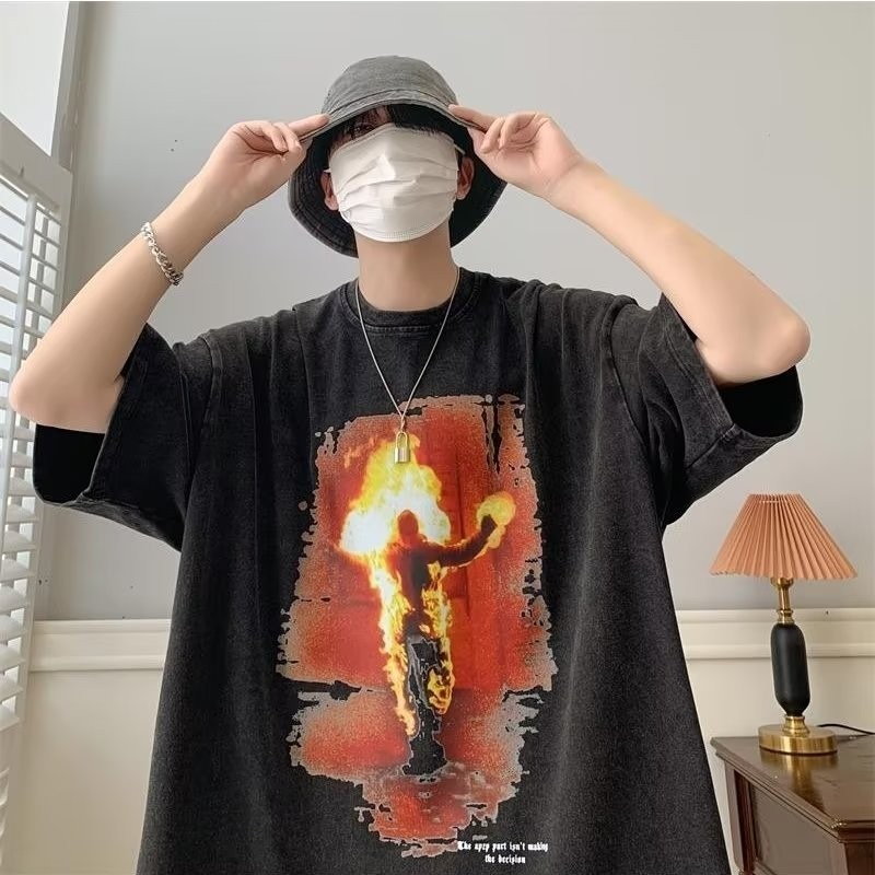 『癮品流行』美式高街做舊水洗復古純棉T恤 圓領上衣 五分袖 男生潮流T恤 夏季短袖T恤 休閒百搭 設計感 M-3XL