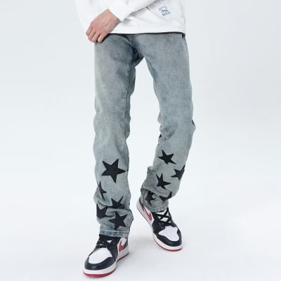 『癮品流行』星星印花 復古高街牛仔長褲 直筒牛仔褲 休閒長褲 設計感 休閒百搭 修身顯腿長 S-3XL