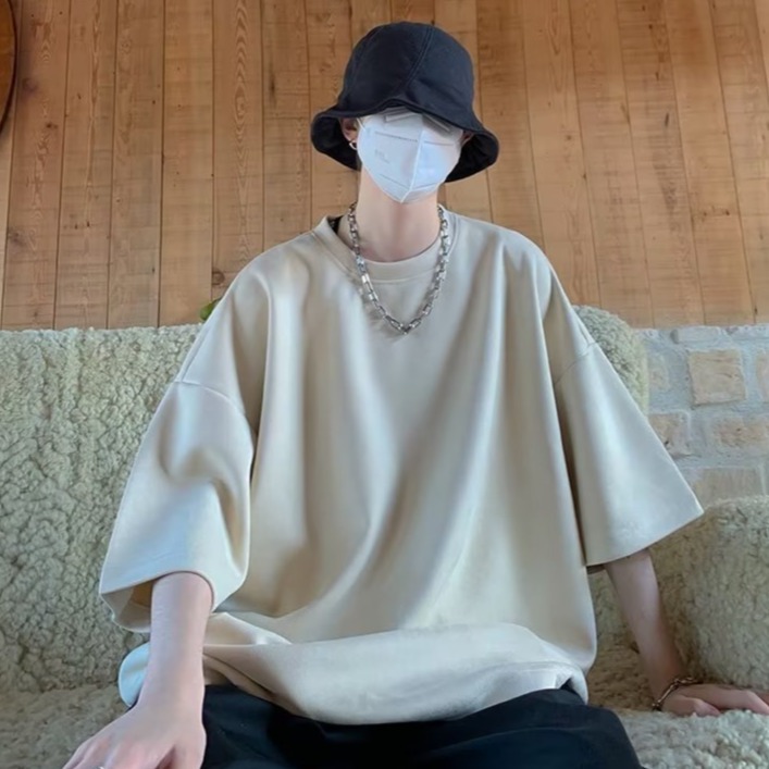 『癮品流行』美式重磅復古高街短袖T恤 麂皮絨T恤 素色T恤 圓領上衣 五分袖 純色簡約 休閒百搭 M-3XL