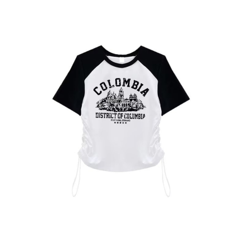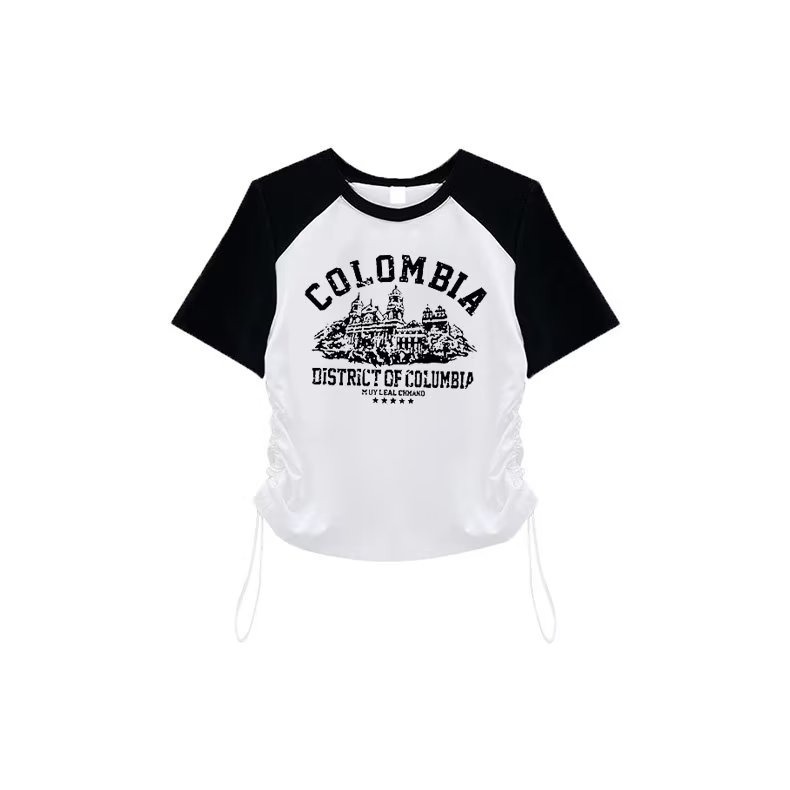 『癮品流行』短版 上衣女 短上衣 顯瘦 抽繩上衣韓版拼接撞色短袖T恤 簡約 T恤 百搭修身正肩上衣女