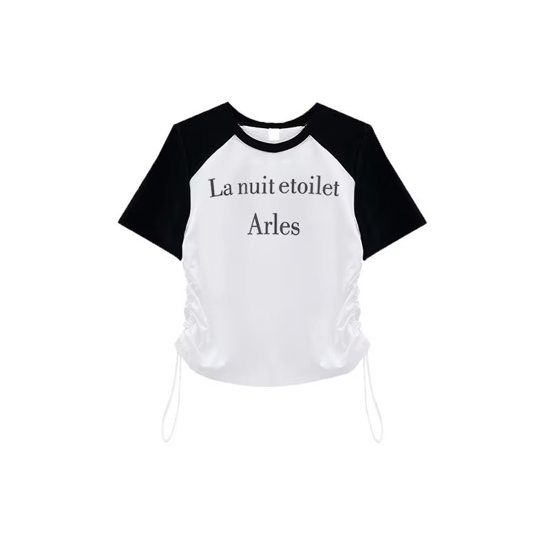 『癮品流行』復古美式字母印花 甜辣妹風 抽繩 撞色 正肩短袖上衣 夏季不規則T恤短版圓領 上衣女
