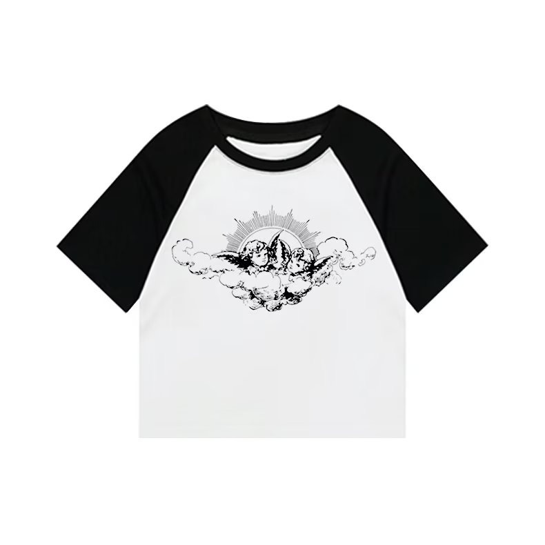 『癮品流行』天使印花 美式復古 插肩袖上衣女生 夏季設計感小眾 辣妹修身 顯瘦短款上衣 純棉T恤