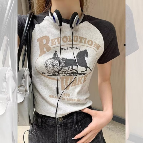 『癮品流行』美式復古辣妹風 潮流上衣 正肩T恤短袖 夏季印花修身 純欲 短款上衣女生