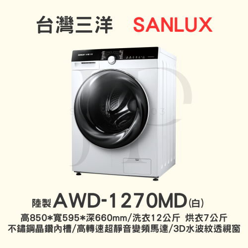 【三洋媽媽樂 】AWD-1270MD【洗烘脫】變頻洗衣機12KG【刷卡分期免手續費】現金另有優惠 多台另議~