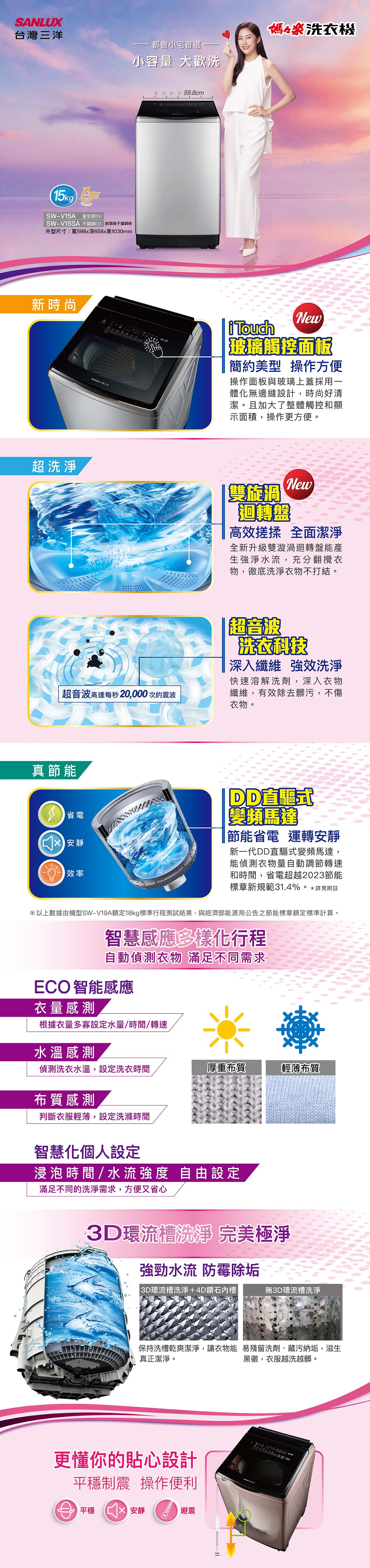 【三洋媽媽樂 】SW-V15A觸控式變頻洗衣機 15KG【刷卡分期免手續費】貨到付更優惠