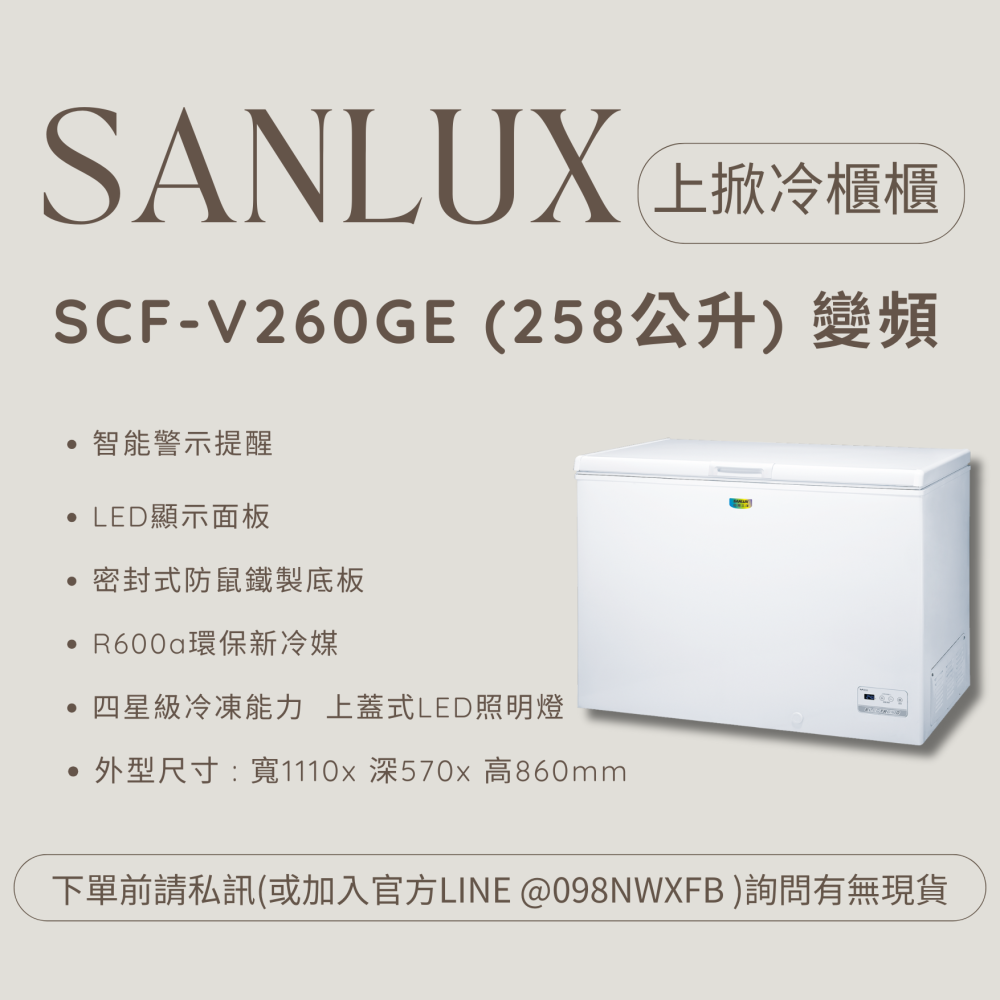 台灣三洋上掀式冷凍櫃 SCF-V260GE 【258公升】【刷卡分期免手續費】貨到付更優惠