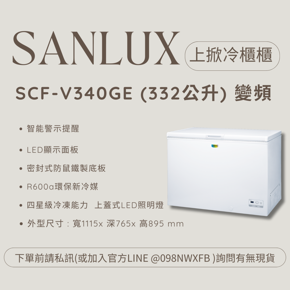 台灣三洋上掀式冷凍櫃 SCF-V340GE 【332公升】【刷卡分期免手續費】貨到付更優惠