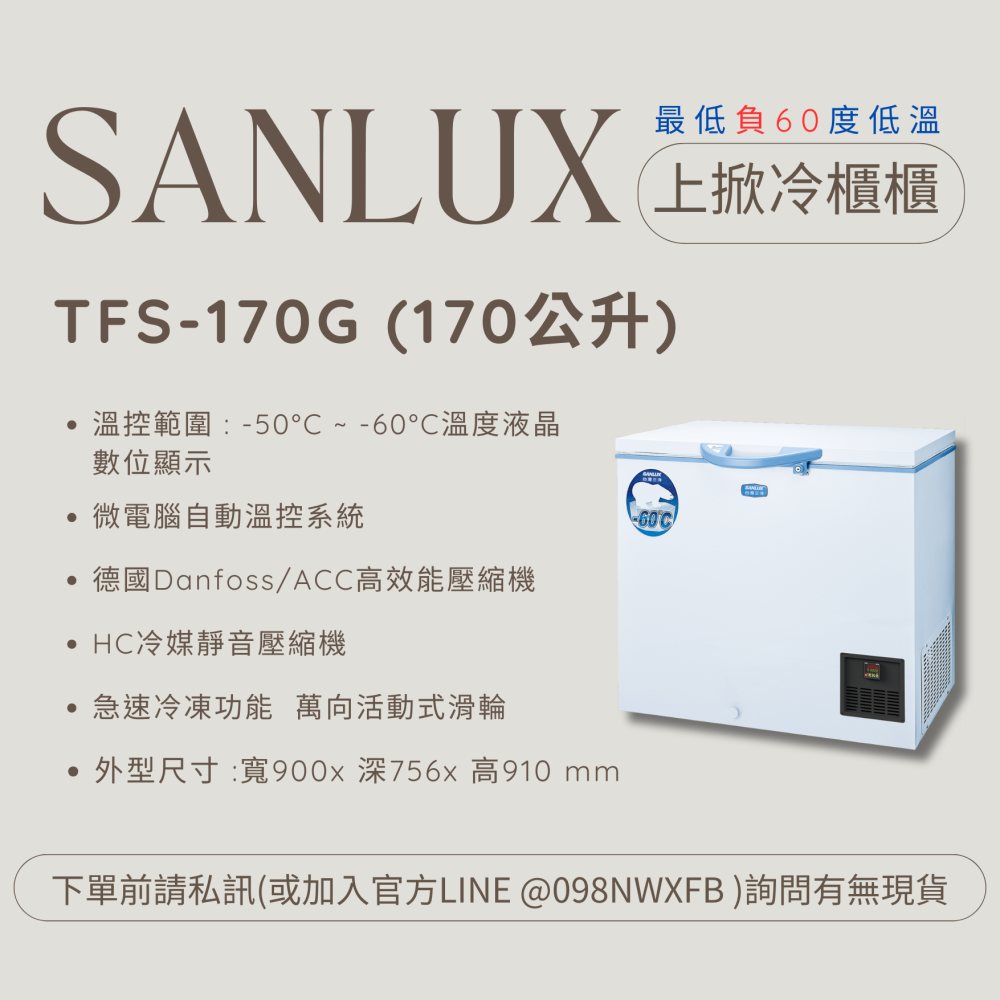 台灣三洋上掀式-60度冷凍櫃 TFS-170G 【170公升】【刷卡分期免手續費】貨到付更優惠