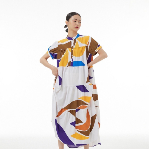 潮流拼色蛋糕裙,夏季寬鬆氣質拼接短袖連身裙5319-218-98
