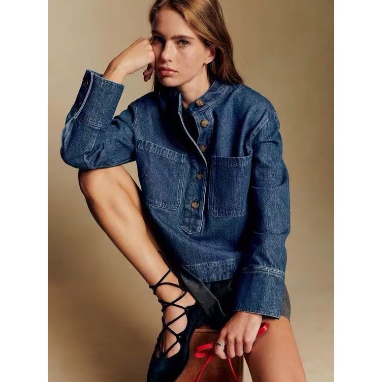 秋冬水洗牛仔棉 立領套頭 拼接工藝 復古半排扣 雙口袋通勤休閒上衣