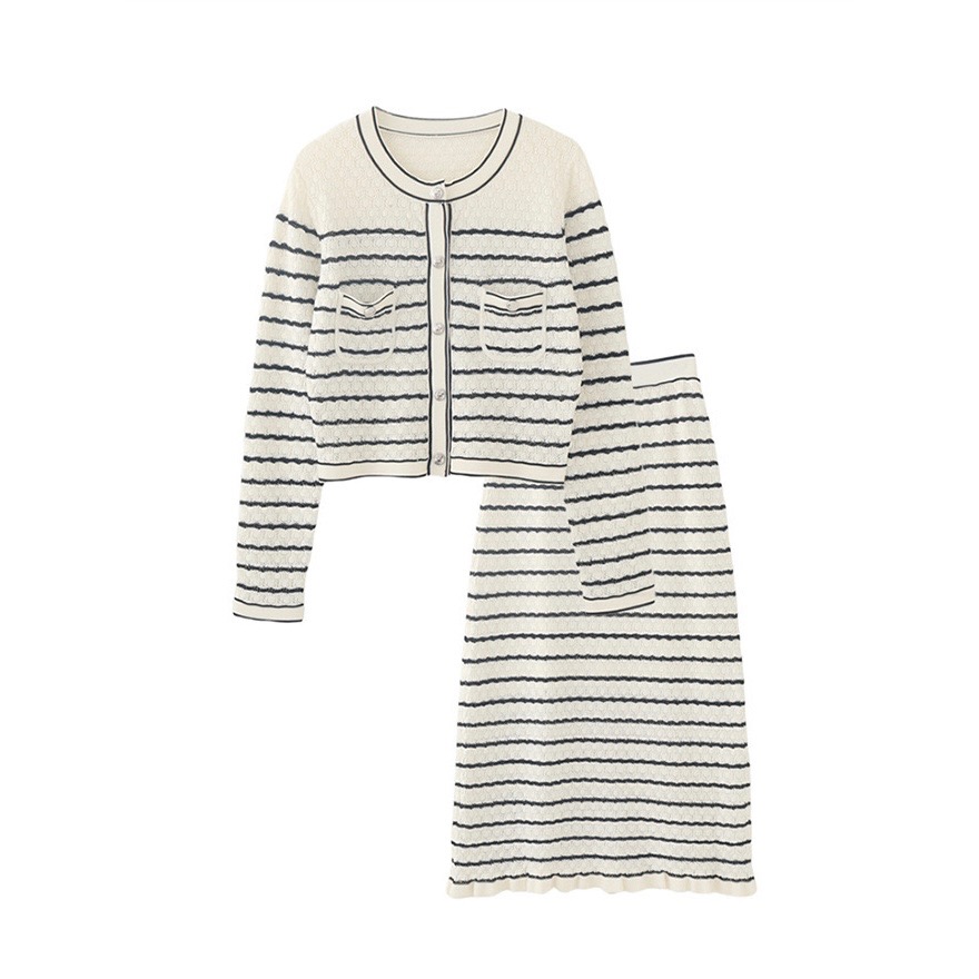 秋季薄款 法式優雅 重工藝條紋口袋 全棉高溫定型 氣質拼色 圓領針織衫 中長裙套裝