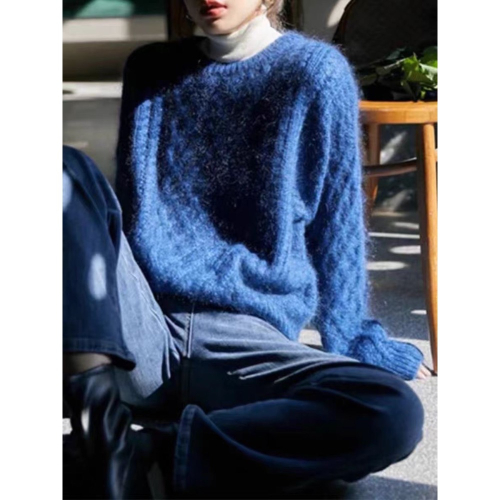 秋冬細羊毛 加厚寬鬆軟綿毛衣 慵懶休閒 麻花勾編 復古圓領 羊毛針織拼接上衣 芥末黃/牛仔藍/深酒紅