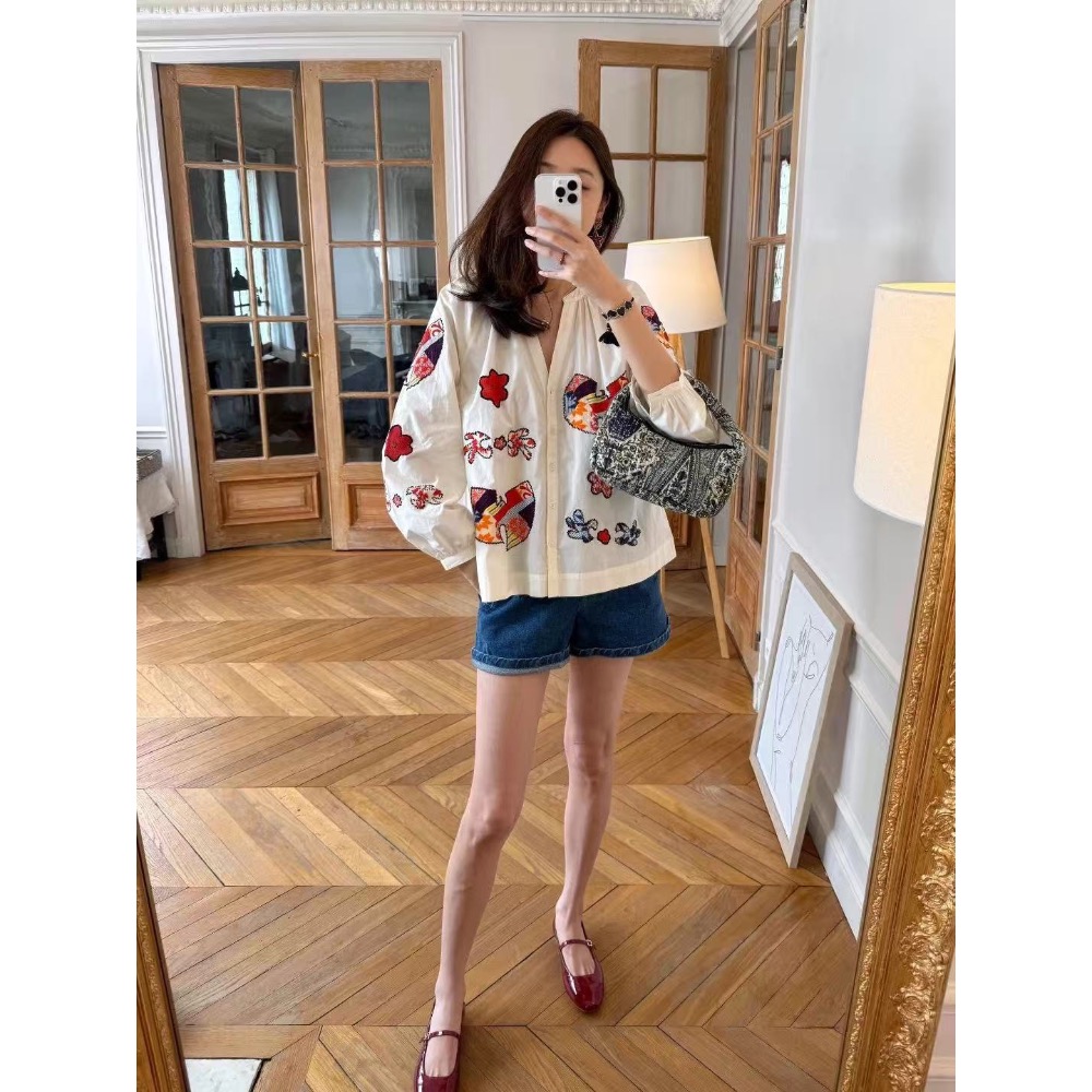 秋冬法式復古時尚 趣味貼布刺繡 V領單排扣可單穿 可當薄外套 棉質寬鬆百搭襯衫
