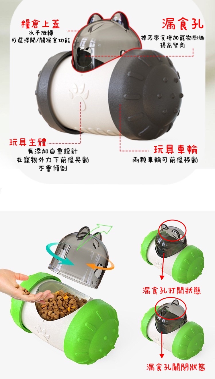 無須電力驅動,在愛貓愛狗玩耍中可自己移動,漏食功能,減緩愛貓愛狗進食速度。
