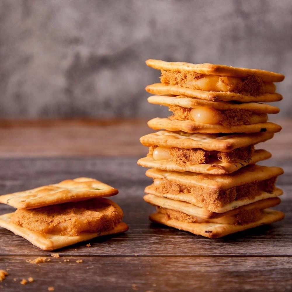 使用鮮奶、法國鮮奶油、日本海藻糖,經過一段時間熬煮,成了獨一無二的牛奶糖內餡。加入優質的肉鬆,夾入蘇打餅裡,鹹甜好滋味,不黏牙,
