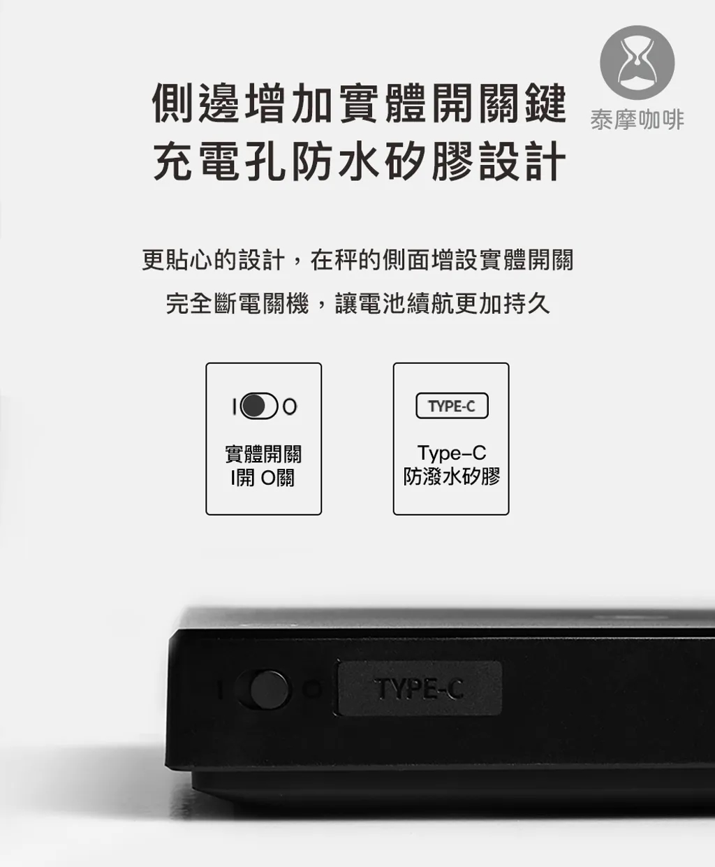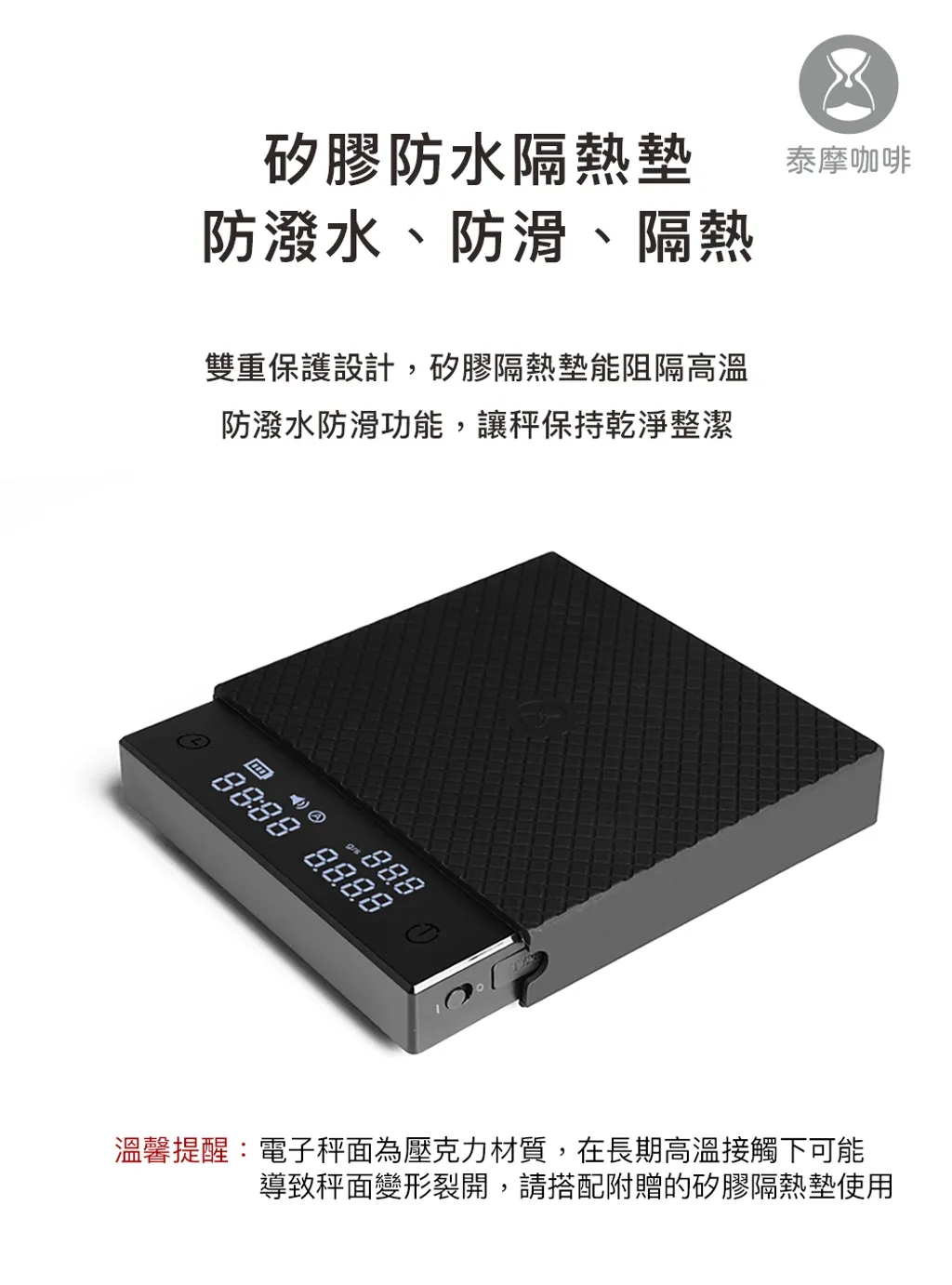 全新防水矽膠充電孔蓋,贈送新款秤面隔熱墊防水抗污,LED觸控隱藏式美型顯示面板,手沖咖啡/料理食物秤超強CP值
