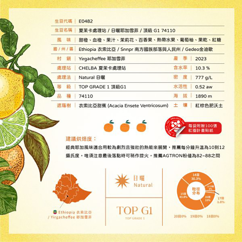 🍊 生豆名稱:日曬夏茉卡 / 紅圈計畫 / 日曬耶加雪菲 / TOP G1 / 74110