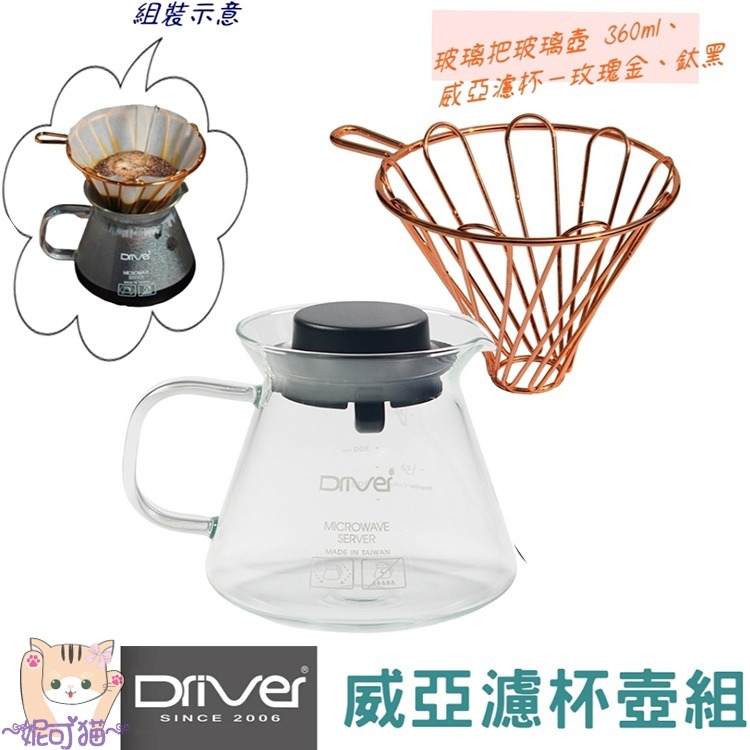 內含:Driver 玻璃把玻璃壺 360ml、威亞濾杯-玫瑰金、矽膠圈