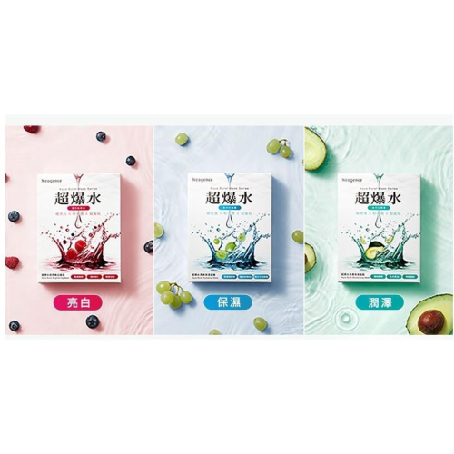 超爆水清爽保濕面膜 ◎ 日本青葡萄精萃,注入清爽保濕力,打造吸飽水的完美膚況! ◎ 添加維他命原B5,修護缺水不適,有感彈嫩保濕。 ◎ 日製微分子玻尿酸,水分超速滲透,全天候維持高涵水力! 超爆水透亮煥白面膜 ◎ 巴西嚴選莓果精萃,喚醒肌膚活力,重現年輕煥白透亮! ◎ 添加肌膚必備維他命C,告別蠟黃粗糙,自帶發光勻亮肌! ◎ 超激亮美白配方穀胱甘肽,深入擊退暗沉,全面提亮膚色。 超爆水潤澤保濕面膜 ◎ 南美酪梨精萃,注入極致保濕力,完美浸潤飽水肌! ◎ 乳木果油深度滋養乾燥缺水,有感豐潤、長效鎖水不間斷。 ◎ 神經醯胺修護肌底,提升澎彈力,維持膚況潤澤飽滿!