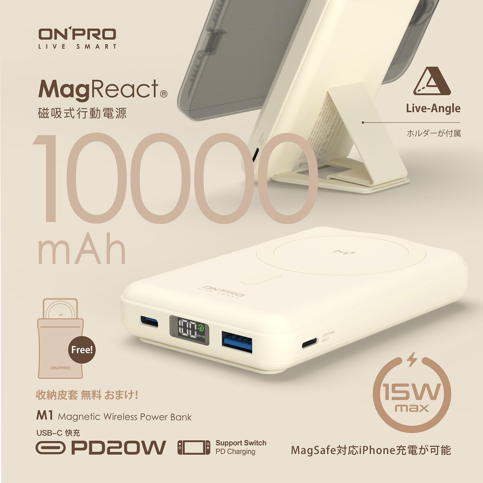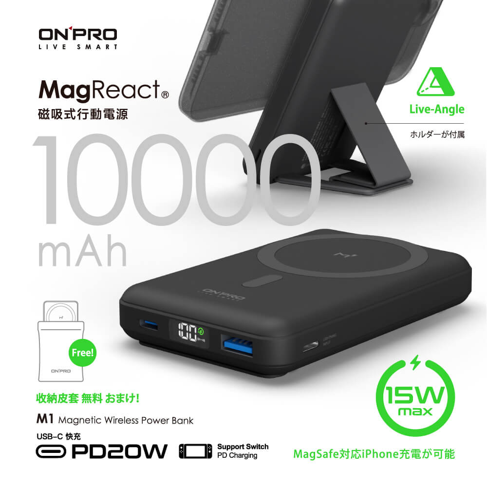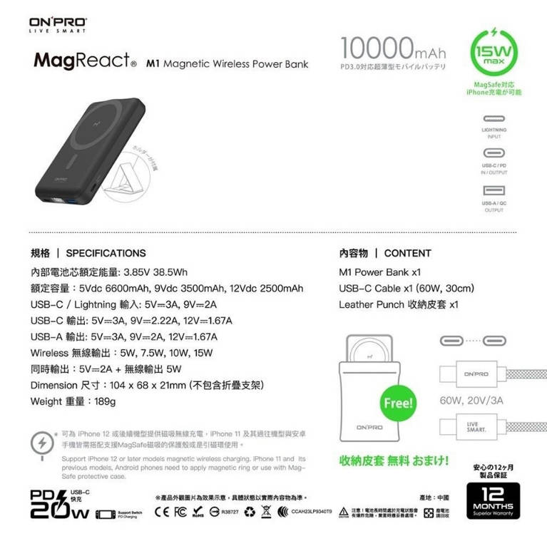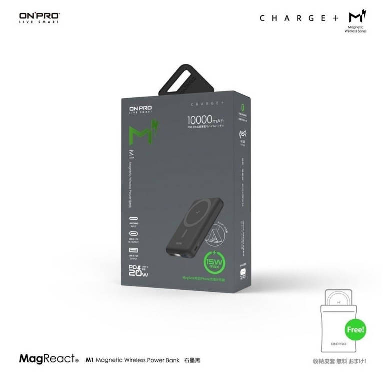 - 包裝內容物:M1 Power Bank x1 / USB-C 快充線 x1 (60W, 30cm) / 收納皮套 x1
