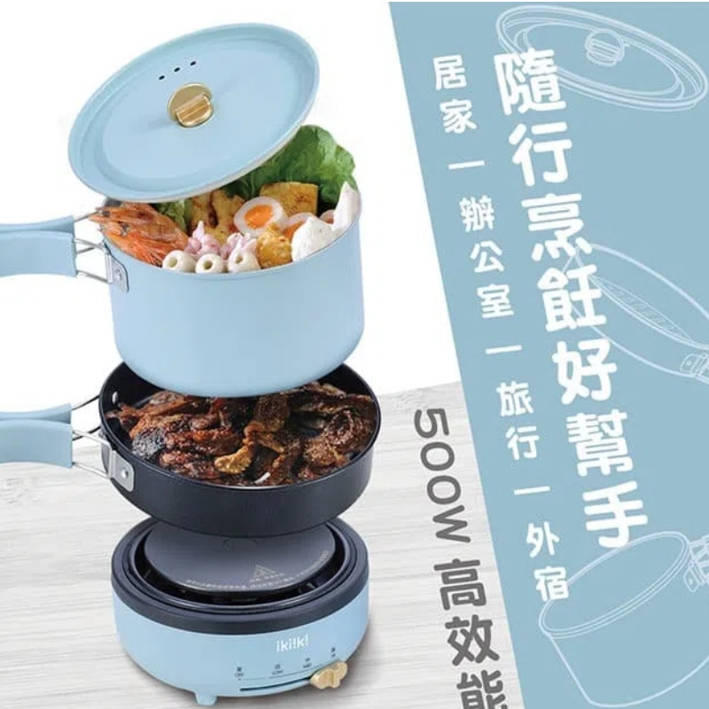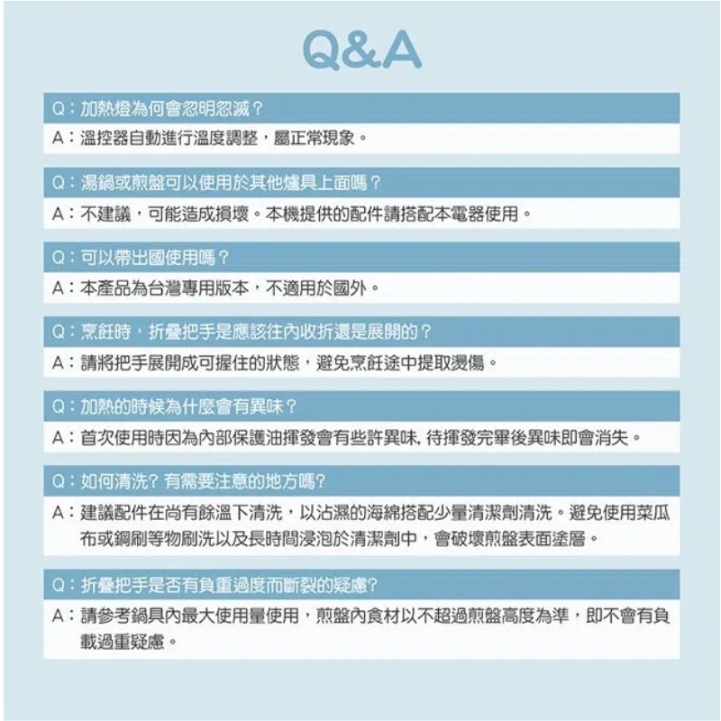 - 配件:本體(電熱盤)、上蓋、不鏽鋼鍋、煎盤、分離式電源線、收納袋