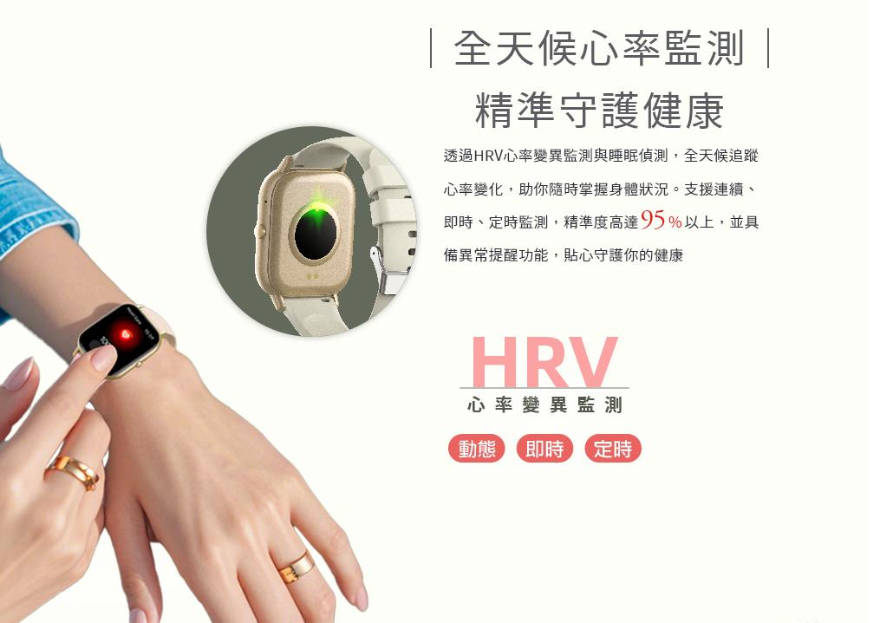- 全天候心率監測|精準守護健康:透過HRV心率變異監測與睡眠偵測,全天候追蹤心率變化,助你隨時掌握身體狀況。支援動態、即時、定時監測,精準度高達95%以上,並具備異常提醒功能,貼心守護你的健康。