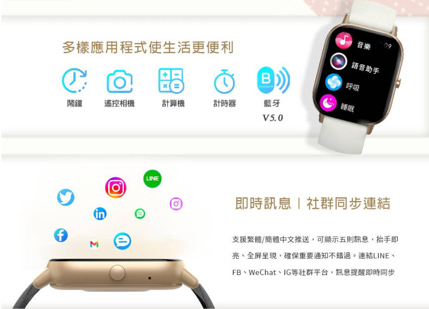 - 即時訊息|社群同步連結:支援繁體/簡體中文推送,可顯示五則訊息,抬手即亮、全屏呈現,確保重要通知不錯過。連結LINE、FB、WeChat、IG等社群平台,訊息提醒即時同步,讓你時刻與世界保持互動。