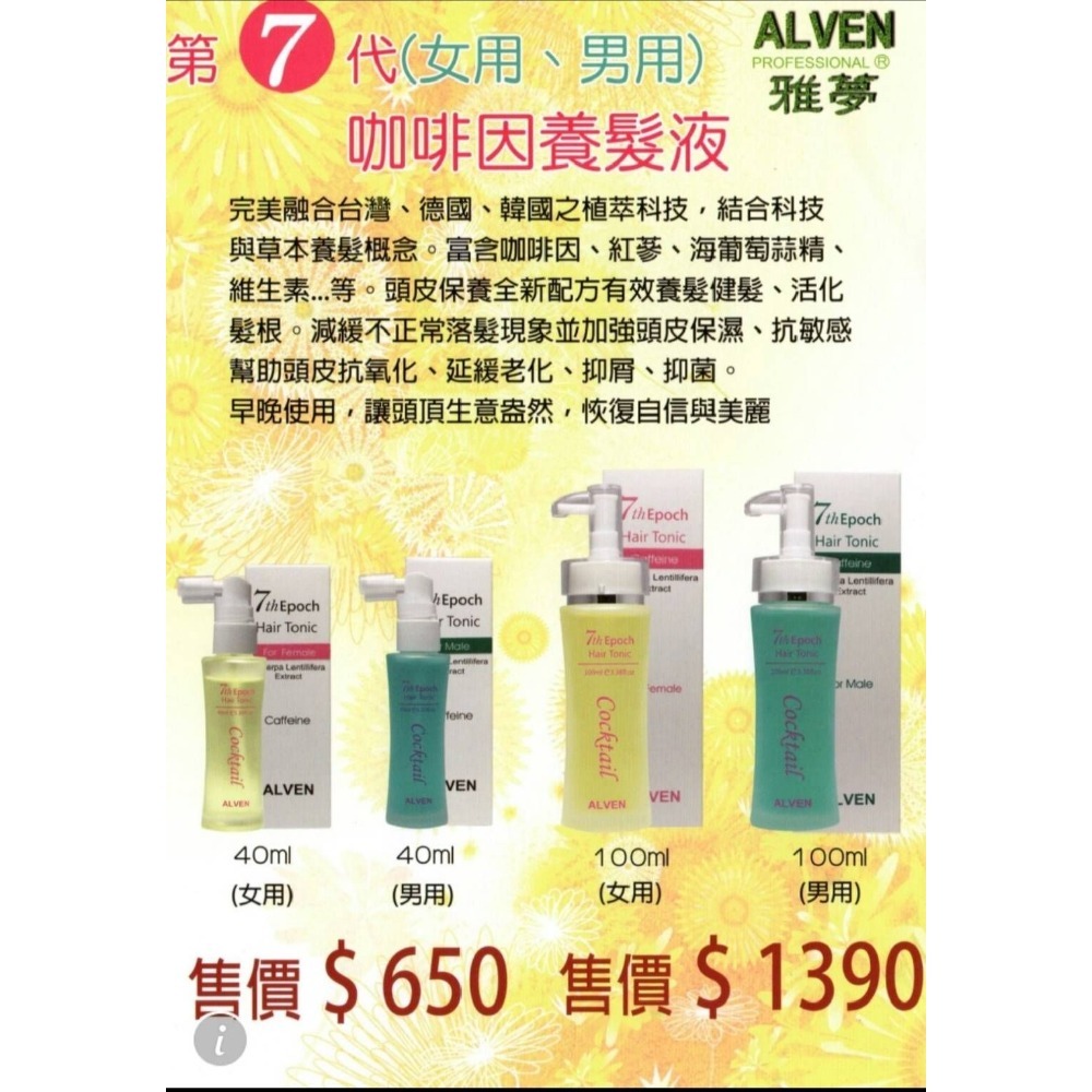 ALVEN 雅夢第七代咖啡因養髮液(男用)100ml(女用)100ml 原價1390元,賣場特價799元