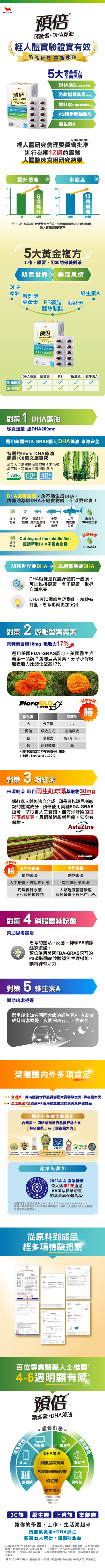 DHA藻油(DHA藻油、葵花油)、脂肪酸甘油酯、葉黃素[紅花籽油、葉黃素(金盞花來源)、抗氧化劑(維生素E)]、磷脂醯絲胺酸(卵磷脂、磷脂醯絲胺酸、中鍊三酸甘油酯)、紅藻萃取物[紅藻抽出物(含蝦紅素)、橄欖油]、維生素A油溶液[維生素A棕櫚酸鹽、花生油、抗氧化劑(維生素E)]。膠囊成分:明膠、甘油、純水