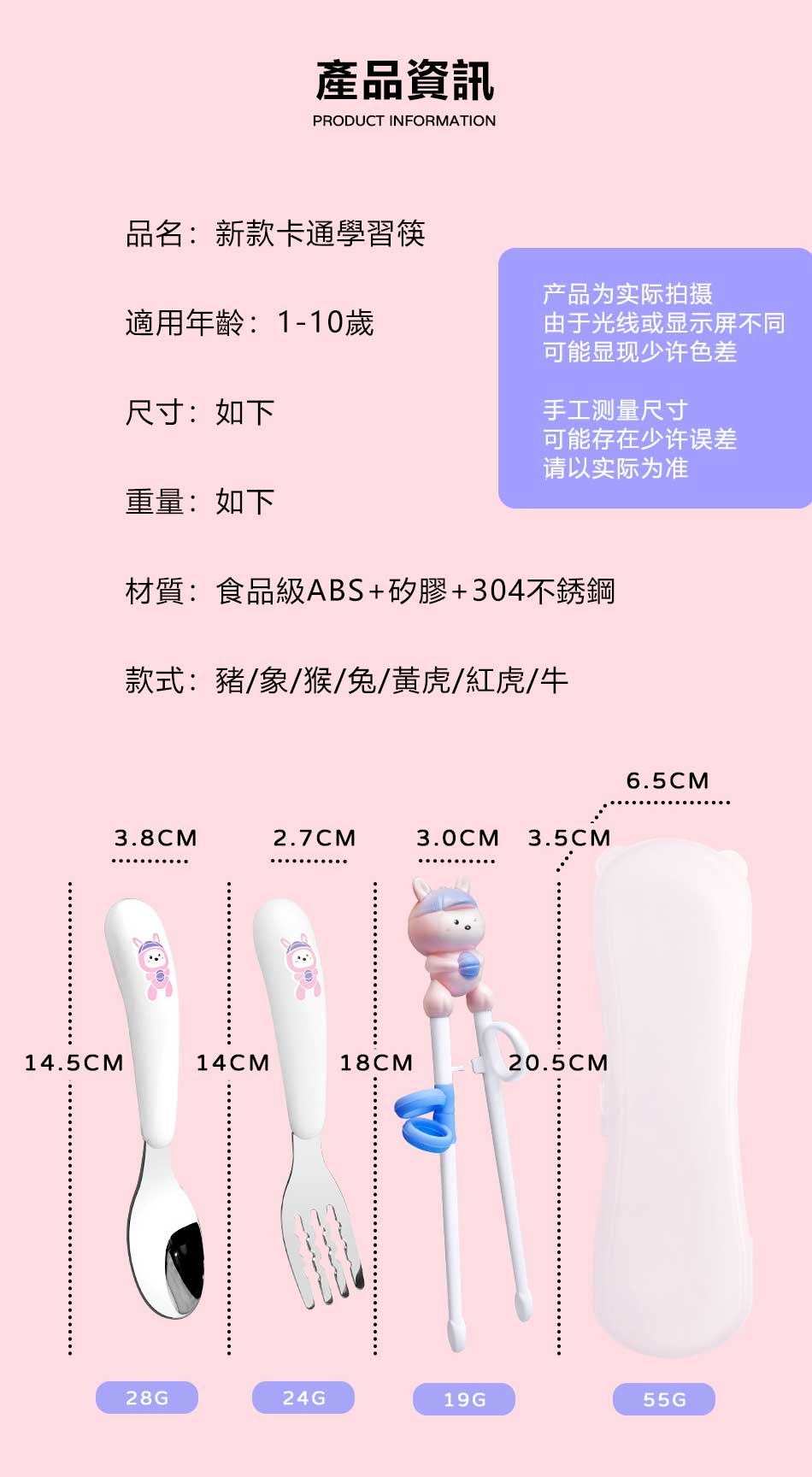 顏色:黃虎 學習筷+304勺叉盒,紅虎 學習筷+304勺叉盒,兔子 學習筷+304勺叉盒,大象 學習筷+304勺叉盒,猴子 學習筷+304勺叉盒,豬豬 學習筷+304勺叉盒,牛牛 學習筷+304勺叉盒