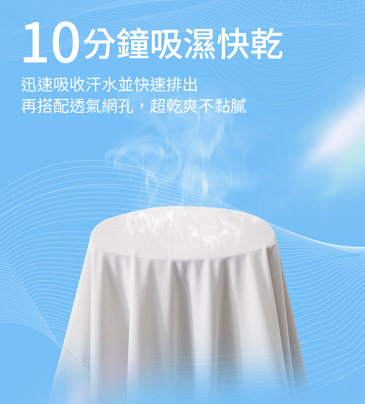 • 10分鐘吸濕快乾,迅速排汗乾爽不黏膩