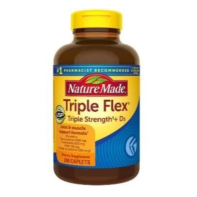 產品概述: 200 個超值瓶裝可提供 100 天的供應量 每天隨餐服用 2 粒膠囊 Triple Flex 含有氨基葡萄糖軟骨素 MSM,有助於支持關節軟骨 無麩質囊片不含合成染料和人工香料 USP 認證、藥劑師推薦的維生素和補充劑品牌 FSA 合格項目 含維生素 D3 的 Triple Flex 三倍強度 Nature Made ®  Triple Flex ®  Triple Strength ‡+  D3 是一種支持關節和肌肉的配方。這種三倍強度‡ 補充劑含有 1500 毫克葡萄糖胺、800 毫克軟骨素和 750 毫克 MSM,以及 2000 國際單位(50 微克)維生素 D3,每日兩粒。† 1500 毫克氨基葡萄糖有助於支持良好的關節軟骨† 800 毫克軟骨素,通過支持關節緩衝來幫助保持關節順暢地移動† 750 毫克 MSM,它是膳食硫的來源,人體在膠原蛋白、結締組織和關節軟骨中使用的微量元素† 2000 IU(50 微克)維生素 D3 支持骨骼、牙齒和肌肉強健† 膳食成分支持良好的關節和肌肉† 美國藥典 (USP) 認證 #1 藥劑師推薦的維生素和補充劑品牌* 氨基葡萄糖是一種天然化合物,是軟骨的組成部分。軟骨有助於維持強健關節所需的結構完整性。† 軟骨素是一種天然存在的化合物,是結締組織(包括關節軟骨)的組成部分。這種化合物通過幫助支撐關節緩衝來幫助保持關節平穩移動。†