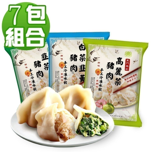 白菜韭黃豬肉水餃—麵粉、水、特選上等新鮮前腿肉、新鮮韭黃、白菜、鹽、糖、醬油、香油、味精