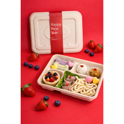 - 年菜成分:雞肉、雞蛋、零乳糖鮮奶、椰子粉、地瓜、米粉、小麥粉、紫薯、小黃瓜、草莓、藍莓、蔬果粉。