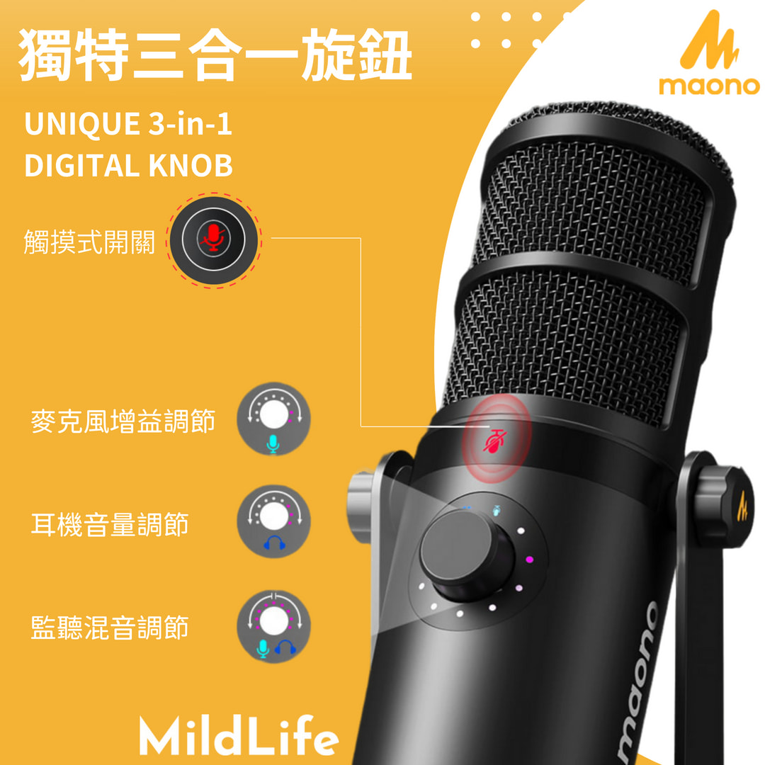 3.Maono Link提供麥克風增益、耳機音量、麥克風音調、等化器、限幅器、壓縮器等功能,3.5mm耳機實时監聽輸出,陞級功放,更好地支持高端監聽耳機