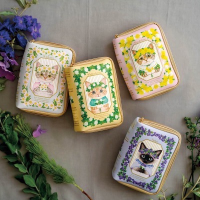 【貓部】合作的知名繪師 -『霜田有沙』老師在2021年初引起話題的童話故事系列商品後,這次以 “花語” 為主題設計出植物圖鑑的貓部收納/化妝包。可愛的貓兒們帶著不同的花兒編織成的花冠成為圖鑑的封面。而花語的部分也呈現在封面與書背上。光是看著就很療癒呢。