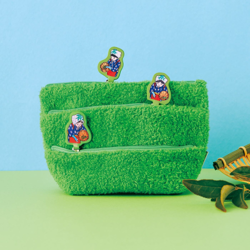 本款收納包就是以『八十八夜』的文化意涵為設計理念而開發的。在半山腰上的茶田裡,身著和風傳統服飾的少女來回走動將最新鮮的茶葉摘下。收納包的表布以絨毛材質重現茶田的模樣。將拉鍊拉開後,總共三層的收納夾層裏布以『深、中、淺』三種不同綠色來代表茶葉在烘焙時的『深焙』、『中焙』、『淺焙』三種不同階段。