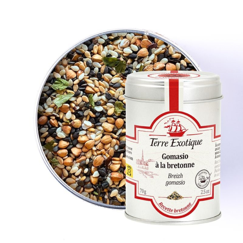 這是來自法國布列塔尼Saint-Cast製作的日式香鬆Gomasio,由蕎麥、黑芝麻、烤芝麻、白芝麻、紫紅藻、紫菜、海鹽…按黃金比例混和製作,用於提升各種料理的風味。它常用於灑在米飯、沙拉、湯或蔬菜上,為菜餚增添濃郁的芝麻香氣與淡淡的鹹味。因為鹽含量低、芝麻富含健康脂肪和營養,也是健康飲食的選擇之一。