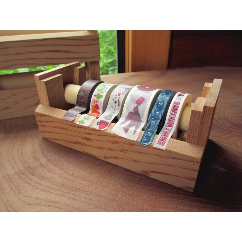 使用木色較深美國側柏與阿拉斯加扁柏原木搭配製作,有著古物雜貨的質感;以功能與實用性為主的設計,側板的斜角與圓軸放置處的斜度讓抽取紙膠帶時更穩固順手,剛剛好的尺寸,一個架子可以放6~15個紙膠帶,底部凹角設計可讓紙膠帶架穩穩的往上堆疊,手作迷要擴充多少可愛紙膠帶都不是問題喲!