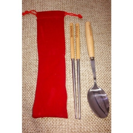 1. 全新 不鏽鋼 木柄餐具組 (筷子+湯匙+收納袋) 上海銀 環保餐具組 不鏽鋼餐具組 筷子長約19cm (紅色收納袋)