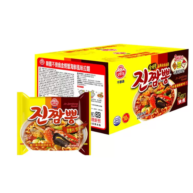 成分 【麵條】小麥粉,醋酸澱粉,馬鈴薯澱粉,棕櫚油,小麥麵筋,蝦風味醬(蝦萃取物,酵母萃取物),食鹽,調製油脂[寡醣,大豆油,抗氧化劑(維生素E),卵磷脂,脂肪酸甘油酯],品質改良劑(多磷酸鈉,多磷酸鉀,碳酸鈉,碳酸鉀,酸性焦磷酸鈉),關華豆膠,海藻酸鈉,羧甲基纖維素鈉,綠茶萃取物,維生素B2 【調味醬包】水,海鮮風味醬(魷魚,糊精,甜椒,大蒜,蝦),海鮮風味醬(魷魚,蟹,淡菜,鯷魚,鱈魚), 魷魚萃取物(魷魚,水飴,葡萄糖),淡菜萃取物,昆布萃取物(昆布,糊精,食鹽,牡蠣),柄海鞘萃取物(柄海鞘,食鹽), 魷魚萃取物(魷魚,食鹽,糊精),酵母調味料(食鹽,糊精,酵母萃取物),大蒜,辣椒,雞肉萃取物,牛骨萃取物,洋蔥,牡蠣萃取物(牡蠣,糖,糊精),糖,糊精,水解大豆蛋白,淡菜萃取物,海鮮調味料(魷魚,食鹽,糊精,蝦),調味劑(5'-次黃嘌呤核苷磷酸二鈉,5'-鳥嘌呤核苷磷酸二鈉),醬料[豬油(韓國產),大豆,淡菜萃取物],辣椒萃取物,胺基乙酸,DL-胺基丙酸 【蔬菜包】乾白菜,乾高麗菜,乾魷魚,乾胡蘿蔔,乾魚板(鱈魚,馬鈴薯澱粉,蟹),乾海苔(裙帶菜),乾青蔥,乾毛木耳 【調味油】調味油(玄米油, 魷魚,洋蔥,辣椒),辣味風味油(大豆油,辣椒),調味油(玉米油,大蒜,洋蔥,甜椒),調味油(芥花油,甜椒,洋蔥)